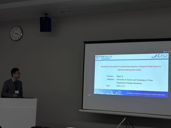 刘冰作了题为“Simulation and analysis of mechanical properties of magnetic fluids based on spherical chain particle model”的口头报告。