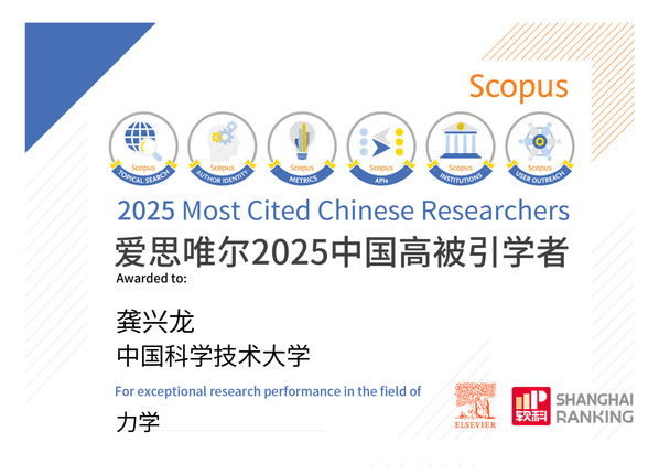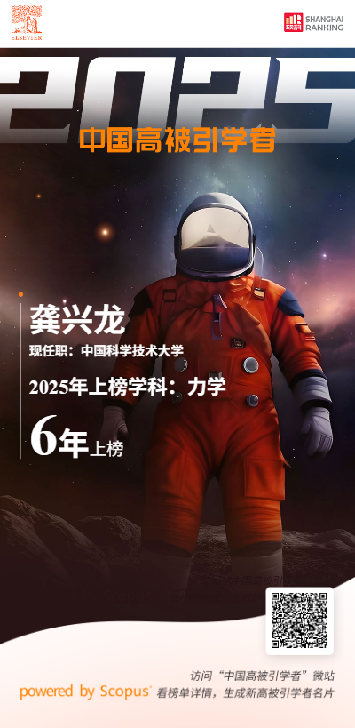 2025“中国高被引学者”上榜共计6310人,来自543所高校、企业及科研机构,覆盖了教育部10个学科领域、83个一级学科。我系陆夕云院士、龚兴龙教授和闫锐教授入选力学榜单。龚兴龙教授已连续6年上榜!