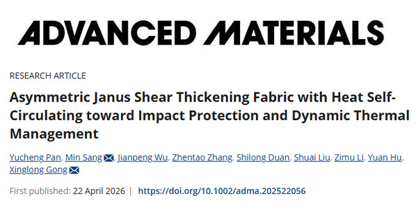 针对上述挑战,中国科学技术大学龚兴龙教授、桑敏特任副研究员团队开发了一种具有非对称Janus结构的剪切增韧织物(命名为SKMP)。该织物将剪切增韧、光热转换和相变储能三种物理机制集成于单一的Kevlar体系中,实现了力学防护与动态热管理的协同平衡。研究表明,该复合材料织物的撕裂强力高达621 N,极限穿透速度达125.79 m/s,且在极低MXene负载量(0.47 wt.%)下实现了12.4°C的光热温差,展现出优异的冲击防护与全天候热调控能力。相关论文以“Asymmetric Janus Shear Thickening Fabric with Heat Self-Circulating toward Impact Protection and Dynamic Thermal Management”为题,发表在Advanced Materials上。