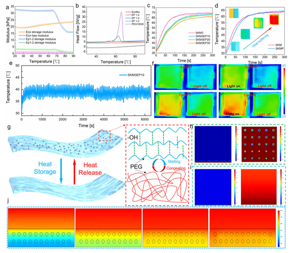 图5 (a) Ecoflex和EP1-2在20°C至90°C范围内的储能模量和损耗模量随温度变化曲线。(b) 各样品的DSC曲线。(c) 1个太阳辐照下样品的背面温度。(d) 半覆盖EP材料的样品背面温度。(e) SKMP的光热与相变循环曲线。(f) 对应循环试验的红外图像。(g) EP复合材料中相变过程示意图。有限元分析显示(h) EP复合材料和(i) Ecoflex的相变过程。(j) SKMP的热传递过程模拟。