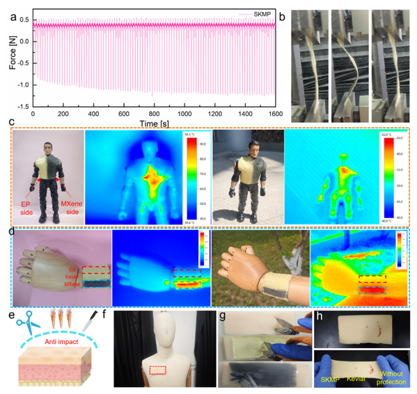 图6 (a) SKMP复合织物的循环弯曲测试。(b) 弯曲过程的数码照片。(c) 所设计背心和(d)腕带的光学与热红外图像,展示热调控行为。(e) 突发冲击下的冲击防护示意图。(f) 配备人造皮肤的人体模型。(g) 不同样品剪切过程的数码图像。(h) 不同防护下人造皮肤的光学图像。