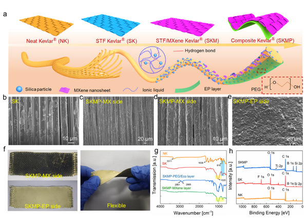 研究团队采用浸渍‑喷涂‑刮涂的逐级制备工艺构建了SKMP复合织物。首先,将Kevlar织物分散于稀释的剪切增稠液(STF)中,通过超声辅助浸渍使STF均匀附着于Kevlar纤维表面。扫描电镜图像显示,与纯Kevlar光滑的表面不同,SK织物纤维表面出现明显的颗粒附着物,结构更为致密(图1b)。随后,通过喷涂法将MXene纳米片沉积于织物表面,在80°C加热板上快速干燥。SEM图像表明,MXene纳米片大面积包裹纤维,表面更加粗糙,纤维间隙进一步收窄(图1c、1d)。最后,将聚乙二醇(PEG)与Ecoflex混合后在织物另一侧进行刮涂固化,形成连续的封装界面(图1e)。所得SKMP织物呈现出由正面MXene层和背面PEG封装层构成的不对称Janus构型,同时可轻松弯折,展现出良好的柔韧性(图1f)。傅里叶变换红外光谱和X射线光电子能谱分析进一步证实了STF、MXene和相变功能层均能通过简便工艺稳定固定在Kevlar织物表面,且界面相互作用牢固(图1g、1h)。