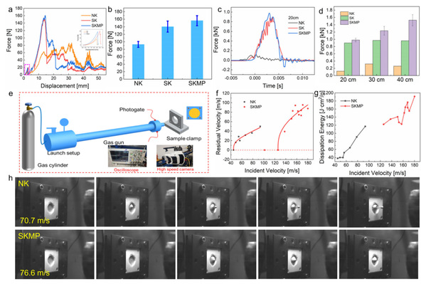 图3 (a) NK、SK和SKMP的静态穿刺曲线。(b) 相应穿刺峰值力。(c) 不同落锤高度下的动态穿刺峰值力。(d) 各样品在20 cm落锤高度下的能量吸收。(e) 弹道冲击测试中SKMP的入射速度与残余速度关系。(f) NK、SK和SKMP的弹道极限速度汇总。(g) SKMP的多尺度能量耗散机制示意图。