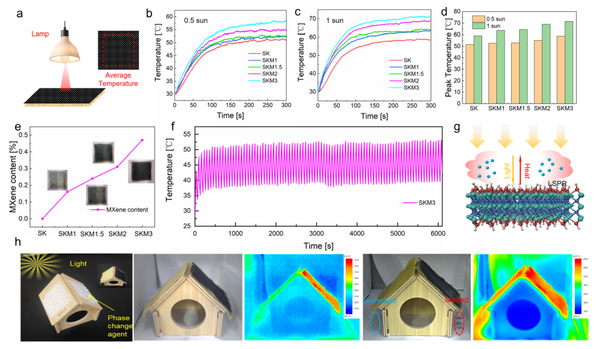 图4 (a) 光热测试装置示意图。(b) 不同MXene含量样品在1个太阳辐照下的温度-时间曲线。(c) 相应平均稳态温度。(d) SK和SKM3的红外热像。(e) SKM3中各组分的质量分数。(f) SKM3的100次光热循环曲线。(g) MXene光热机理示意图。(h) 模型房屋光热演示的数码照片及红外图像。