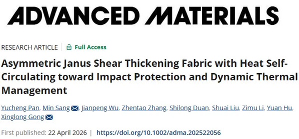 原文链接:Pan YC, Sang M*, Wu JP, Zhang ZT, Duan SL, Liu S, Li ZM, Hu Y, Gong XL*. Asymmetric Janus Shear Thickening Fabric with Heat Self-Circulating toward Impact Protection and Dynamic Thermal Management[J]. Advanced Materials, 2026, e22056. https://doi.org/10.1002/adma.202522056.